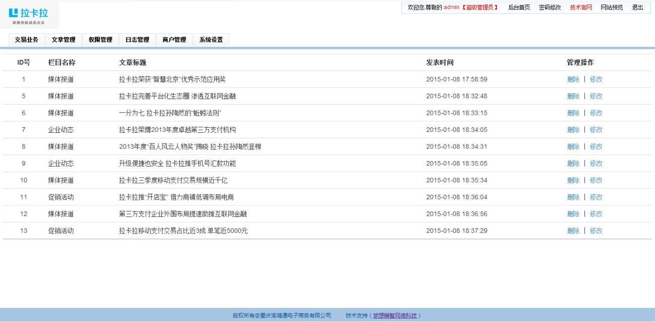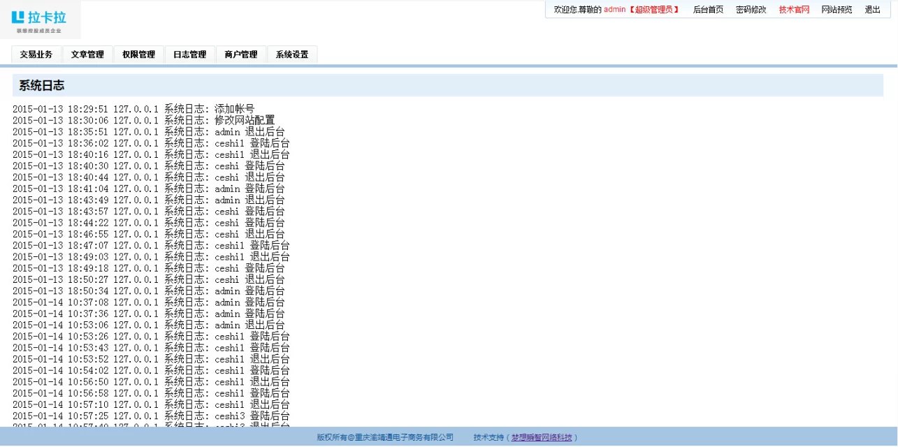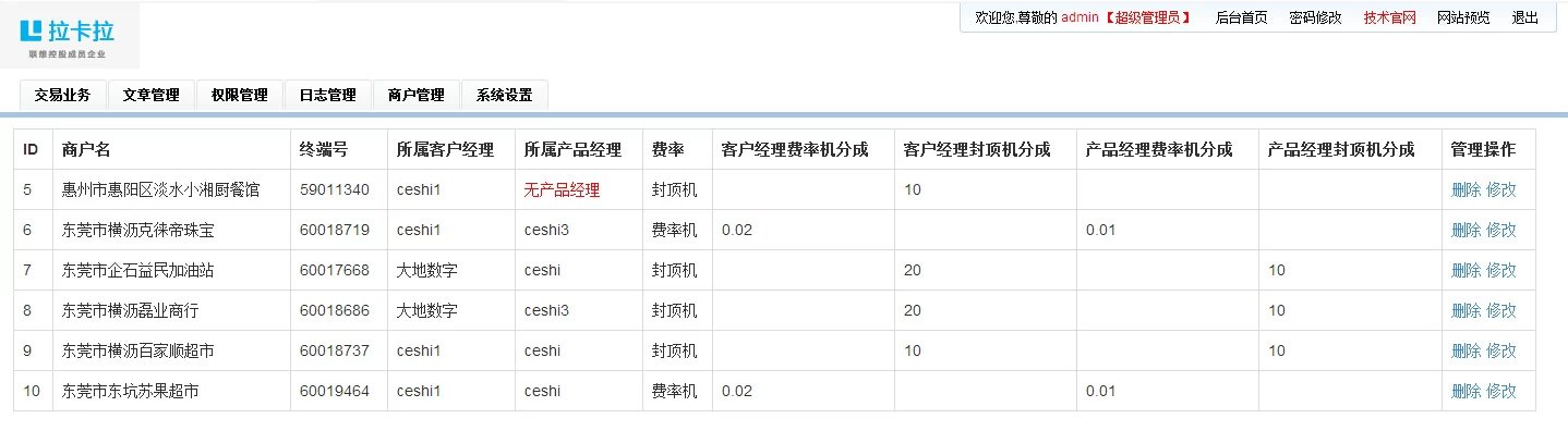 ①:系統(tǒng)網(wǎng)站設(shè)置 ②:商戶錄入 ③:系統(tǒng)日志記錄 ④:權(quán)限管理 ⑤:COOKIE防注 ⑥:SQL防注 ⑦:文章系統(tǒng) ⑧:導(dǎo)入execl.xls交易業(yè)務(wù)數(shù)據(jù),自動(dòng)生成數(shù)據(jù),自動(dòng)按分成比例計(jì)算提成,自動(dòng)計(jì)算客戶經(jīng)理和產(chǎn)品經(jīng)理總提成 ⑨:查詢功能,可按時(shí)間段查詢,當(dāng)天查詢,當(dāng)月查詢,季度查詢等不同數(shù)據(jù)及不同帳號(hào)的總提成