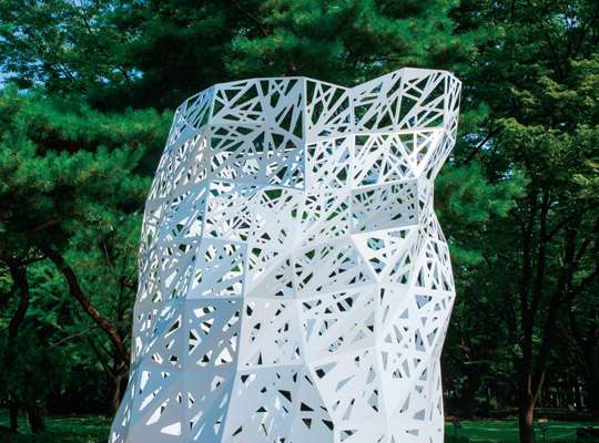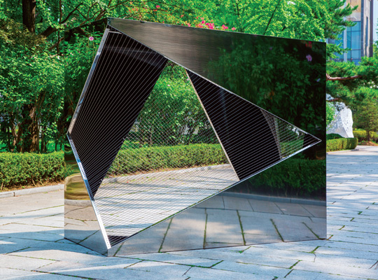 Jeong Hoon Lee從樵夫窺看仙女洗澡的瞬間汲取靈感,于日常場景中打造出這件超現(xiàn)實主義杰作,令人仿佛身臨其境。彼此交纏的鋼絲構筑出三角形輪廓,進而別具匠心地組合成六邊形,突顯了分別代表天、地與中間世界的三個臨界點。鋼絲的伸展走向限制了三角形的無限外延,象征著想要飛向天界的仙女與離不開人間的樵夫之間緊張不安的情感。作品的金屬表面如鏡子般反射出周圍的環(huán)境,令參觀者仿佛身臨這種窺看的情境。