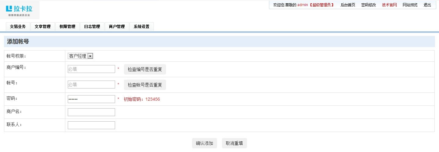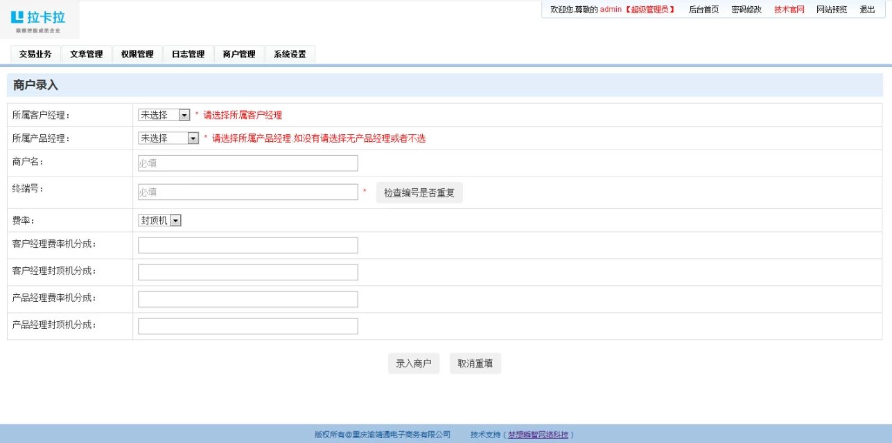 ①:系統(tǒng)網(wǎng)站設(shè)置 ②:商戶錄入 ③:系統(tǒng)日志記錄 ④:權(quán)限管理 ⑤:COOKIE防注 ⑥:SQL防注 ⑦:文章系統(tǒng) ⑧:導(dǎo)入execl.xls交易業(yè)務(wù)數(shù)據(jù),自動(dòng)生成數(shù)據(jù),自動(dòng)按分成比例計(jì)算提成,自動(dòng)計(jì)算客戶經(jīng)理和產(chǎn)品經(jīng)理總提成 ⑨:查詢功能,可按時(shí)間段查詢,當(dāng)天查詢,當(dāng)月查詢,季度查詢等不同數(shù)據(jù)及不同帳號(hào)的總提成
